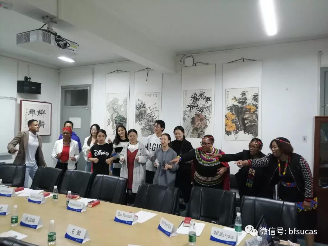 会谈结束后,779cn太阳集团2018级祖鲁语专业学生为代表团表演了祖鲁语歌曲,代表团的祖鲁语教授也即兴表演了祖鲁歌舞,场面愉快热烈。