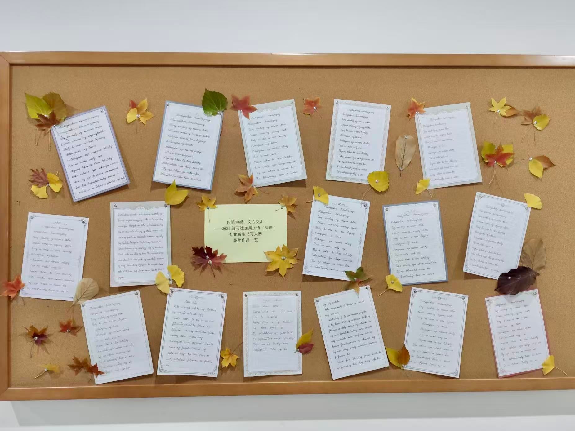 为帮助新生夯实语言基本功,激发学习热情,马达加斯加语教研室于今年9月至10月举办了主题为“以笔为媒,文心交汇”的新生书写大赛。活动获得了同学们的广泛关注和积极参与。经过一个月的勤学苦练与互帮互鉴,全体同学提交了各具特色的作品。评审委员会从拼写准确度、页面规范和整体美观度等多个维度进行综合评定,最终评选出一等奖1名、二等奖2名、三等奖3名及优秀奖4名,其余同学均获鼓励奖。