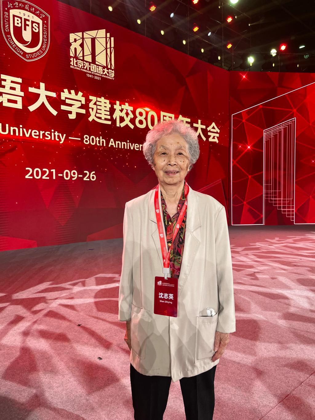 图为沈志英老师在北京外国语大学80周年校庆大会上