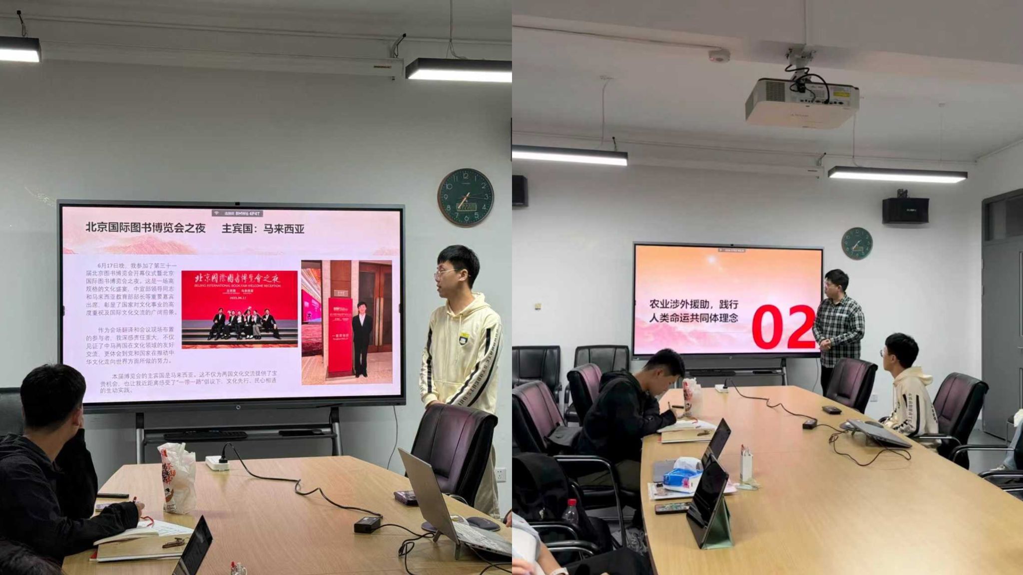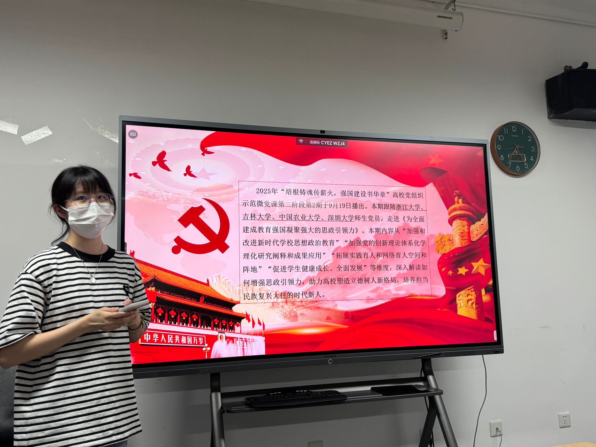 理论学习环节共分为两部分。首先,入党积极分子唐晓峰及入党申请人秦昌盛向与会同志分享了外事外交活动的经验和心得体会。唐晓峰同志分享了自己参加第三十一届北京图书博览会开幕仪式暨北京国际图书博览会之夜以及第十八届中华图书特殊贡献奖颁奖仪式的筹办的经历,表达了身为当代青年将更加积极地投身到中华文化传播的伟大事业中的决心。秦昌盛同志则从自己参加泰国农业文化资产遗产管理与保护研修班以及在智库实习的经历出发,深刻感受到我国正通过农业领域涉外援助践行人类命运共同体理念,也切实体会到国家以二轨外交为重要途径,积极传播中国智慧的责任担当。其次,宣传委员罗雪婷结合9月19日播出的2025年高校党组织示范微党课第二期第二讲的内容,带领与会同志进行理论学习,深刻体会习近平总书记对于教育强国的指示精神。