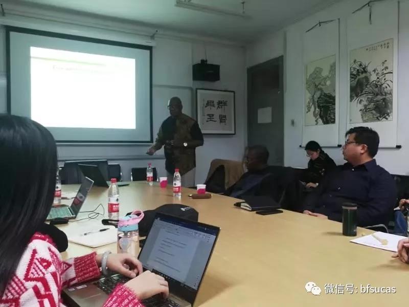 2019年11月19日下午,南非大学坦博·姆贝基非洲领导力学院(Thabo Mbeki African Leadership Institute, University of South Africa)高级研究员Paul Tembe教授为我院师生带来了系列学术讲座之二——“非洲-中国跨文化交际策略:中国在非洲的形象存在于中国在非成功故事之中”。