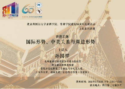 2021年3月31日下午,北外亚洲学院老挝语专业75级校友、现任外交部亚洲事务特使孙国祥大使在图书馆三层报告厅以“国际形势、中美关系与周边形势”为题为全校师生带来了一场内涵深刻、内容丰富的讲座。