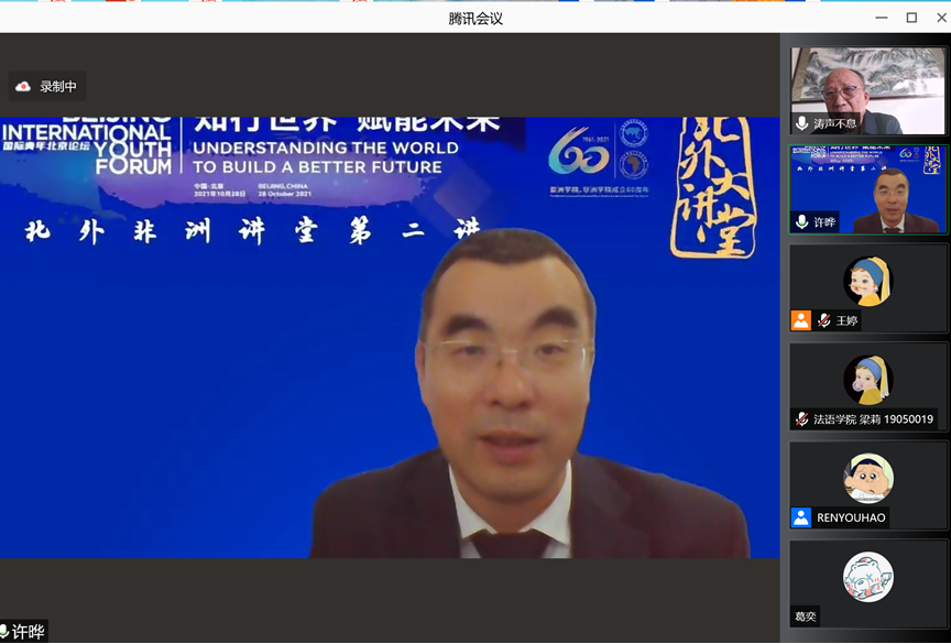 2021年10月27日,779cn太阳集团成功举办“北外非洲讲堂第二讲——扩大中非青年友好交流,巩固中非世代友好”讲座。主讲人为程涛大使,现任外交部公共外交咨询委员、中国非洲研究院特约研究员。亚洲学院、779cn太阳集团党总支书记许晔主持此次讲座。