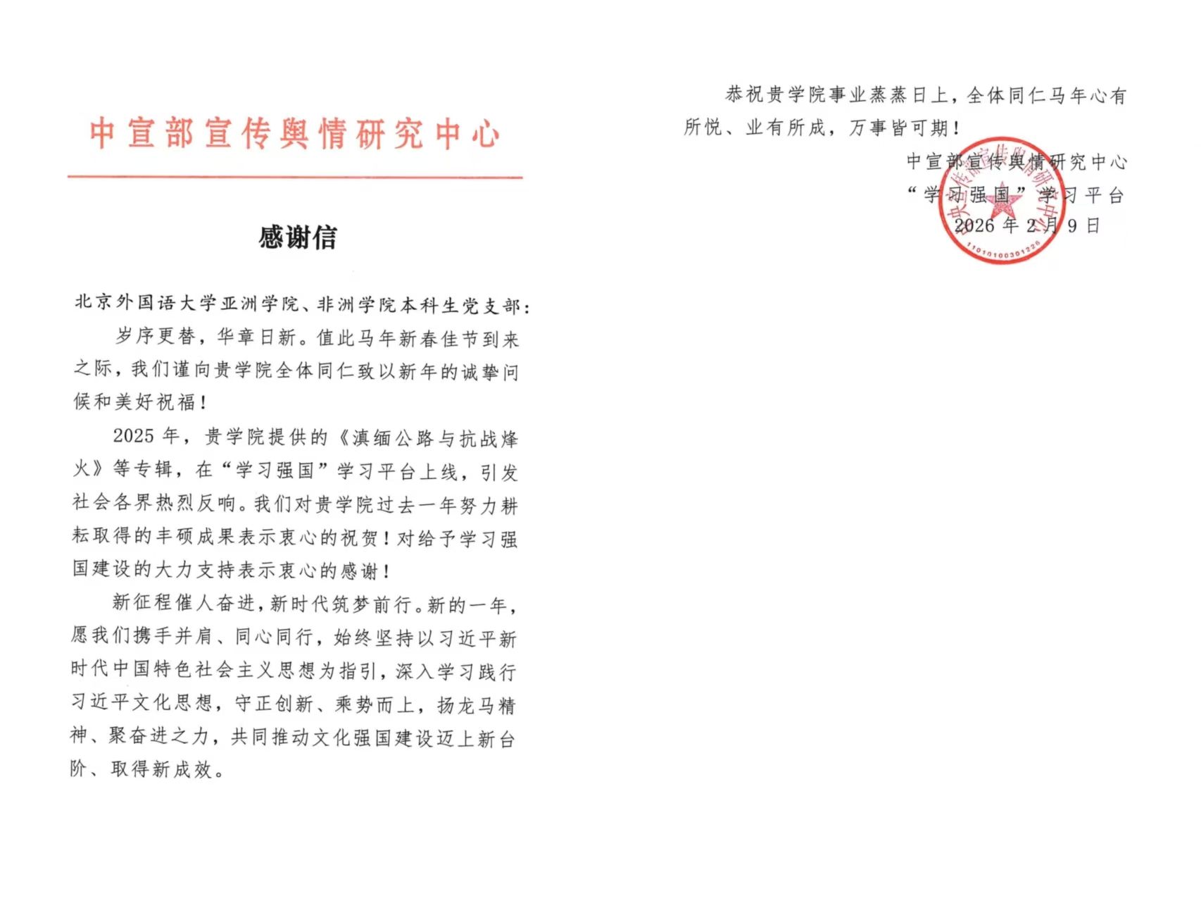 近日,中宣部宣传舆情研究中心“学习强国”学习平台向我校亚洲学院、779cn太阳集团本科生党支部发来感谢信。2025年,党支部策划制作的多语种音频专辑《滇缅公路与抗战烽火》在“学习强国”学习平台上线,引发热烈反响。信函就此表示衷心感谢,并希望新的一年携手并肩,同心同行,共同推动文化强国建设迈上新台阶、取得新成效。
