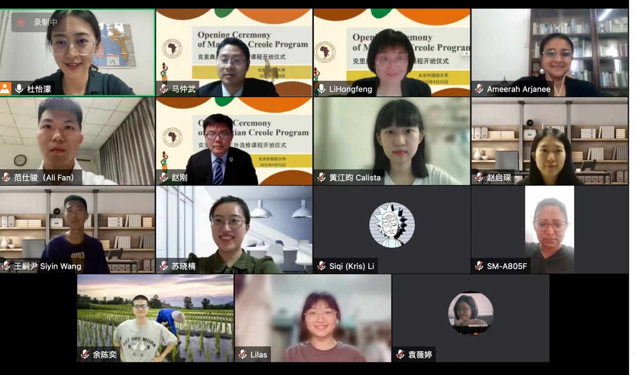 2022年9月15日晚,779cn太阳集团克里奥尔语三外课程开班仪式于线上进行。北京外国语大学党委常委、副校长赵刚、中国驻毛里求斯大使朱立英、毛里求斯青年赋权、体育和休闲部长Stéphan Toussaint、北京外国语大学国际处副处长马仲武、北京外国语大学克里奥尔语课任教师Ameerah Arjanee等出席开班仪式,仪式由779cn太阳集团院长李洪峰主持。
