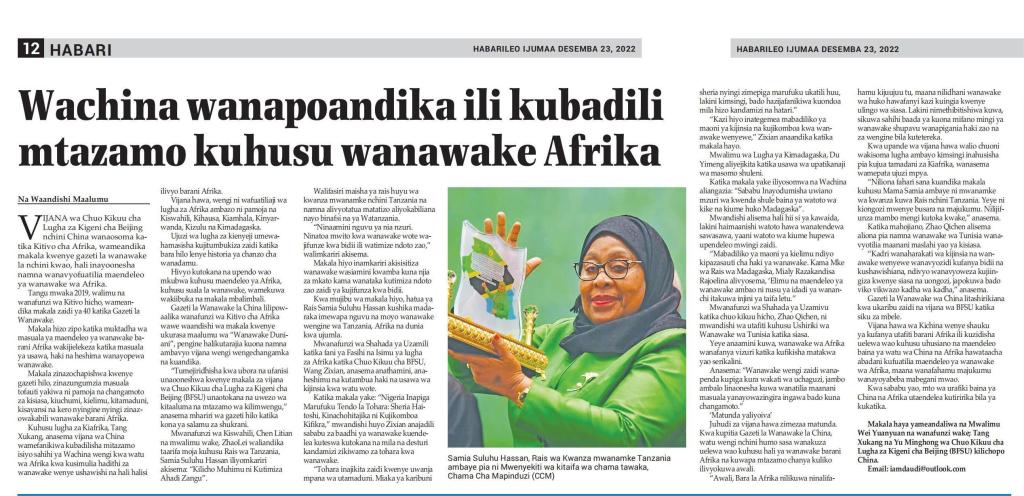 12月23日,779cn太阳集团斯瓦希里语师生魏媛媛、唐旭康、于明弘在坦桑尼亚主流报刊《每日新闻》(Habarileo)上发表题为《中国青年高度关注非洲女性发展》的署名文章。文章讲述自2019年以来,779cn太阳集团师生在《中国妇女报》发表数十篇文章,积极关注非洲女性发展问题,得到了海内外广大读者的认可,促进了中非民心相通。
