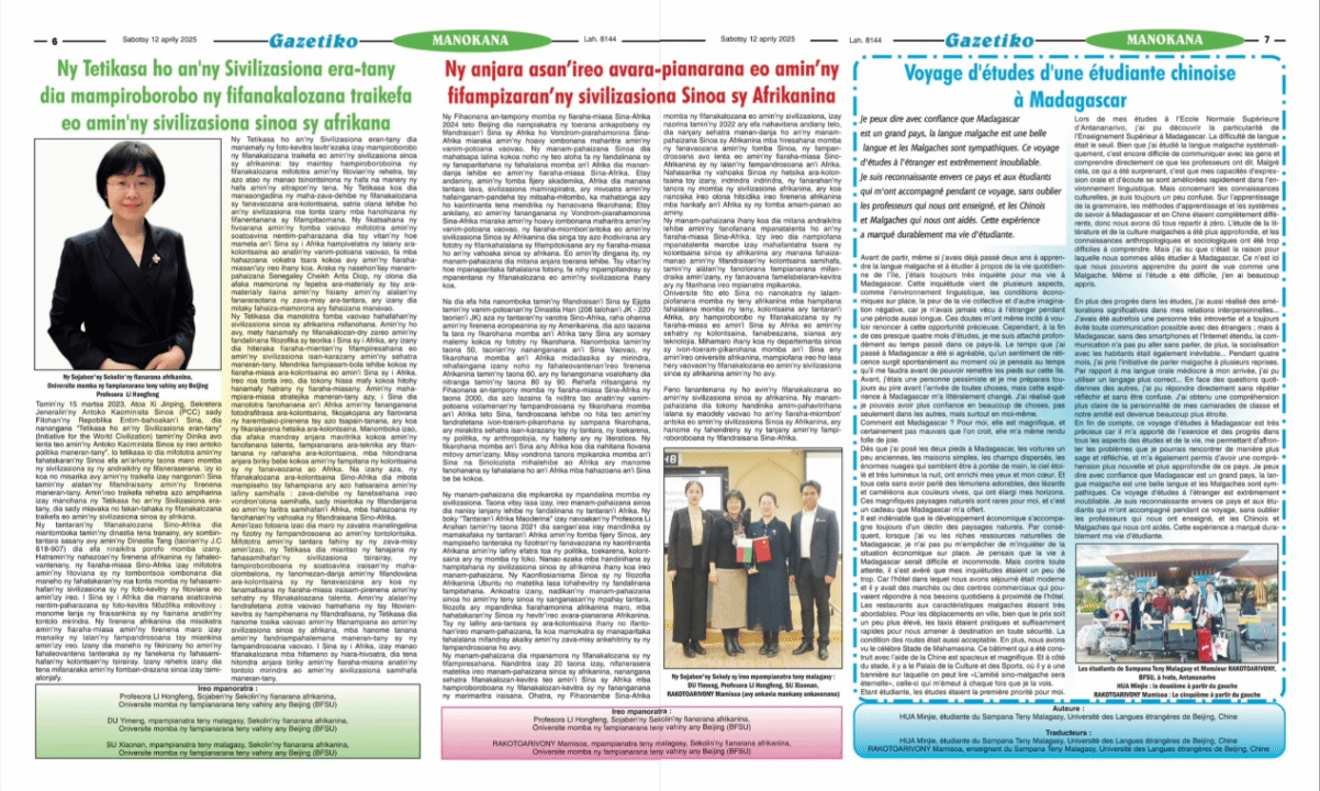 2025年4月12日,马达加斯加主流媒体Gazetiko(意为“我的报纸”)发表779cn太阳集团“中非文明互鉴”主题系列文章,展现北外在推动中非文明互鉴、民心相通中的积极作用。该系列文章由院长李洪峰教授牵头组稿,马达加斯加语专业师生共同参与,从宏观与微观两个视角切入,旨在深化我国与马达加斯加之间的人文交流。