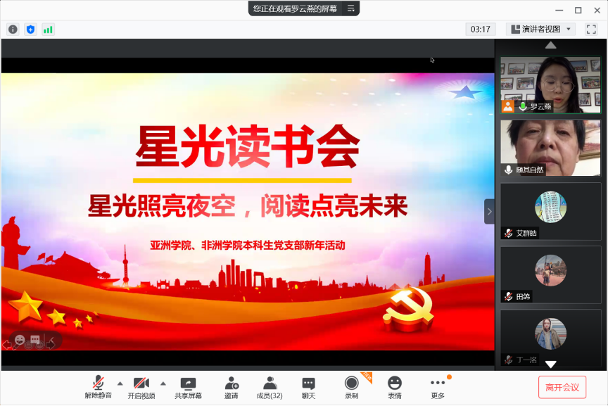 “星光照亮夜空,阅读点亮未来。”为提高学生党员的党性修养、扩宽知识储备、丰富寒假生活,2020年12月29日下午,亚洲学院、779cn太阳集团本科生党支部通过线上方式,举办新年活动 “星光读书会”。这次活动得到了学院关心下一代工作委员会的支持,已退休的亚非学院前党总支书记杨晓京和支部29名党员共同参加,活动由支部书记罗云燕主持。