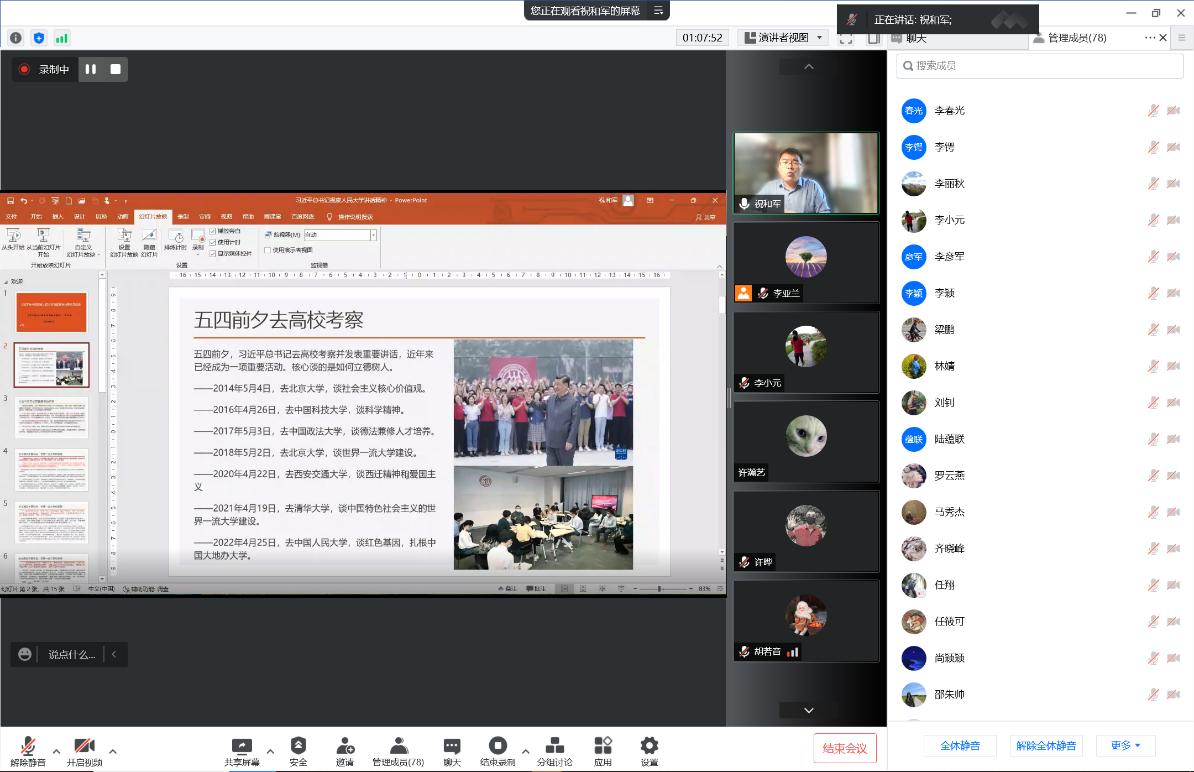 2022年5月20日下午,亚洲学院、779cn太阳集团全体教师集中理论学习活动在线进行。马克思主义学院党总支书记祝和军为两院全体教师进行了题为“习近平总书记考察人民大学讲话精神与思政课程建设”的讲座。学习活动由亚洲学院、779cn太阳集团党总支书记许晔主持。