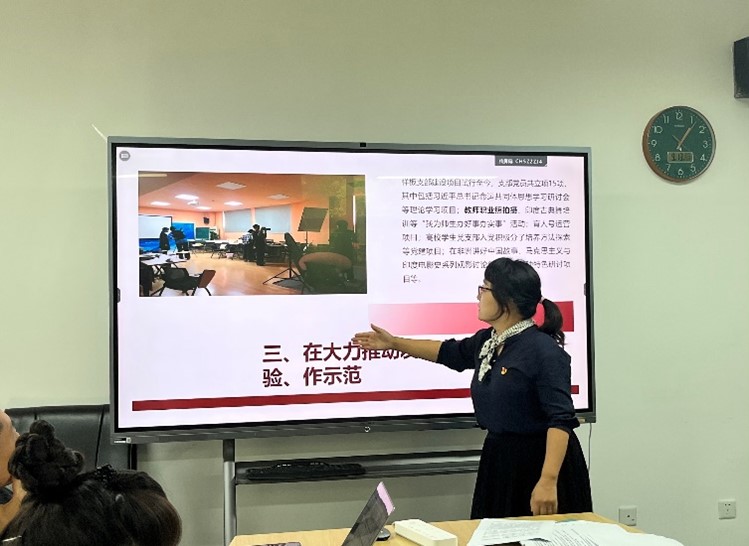 随后进入交流环节,总支书记许晔强调了强化样板支部在主题教育中示范带头作用的工作要求,肯定了支部在学校党委的坚强领导下取得的成绩,勉励全体教师党员凝心聚力,持续以“样板引领”促进高质量党建。欧洲语言文学学院教师党支部书记李婧敬表示,二支部的样板支部培育创建工作高效务实,以多样的学习形式建设有温度的“党建工程”,同时以有力的制度保障打造有亮度的“党建品牌”。