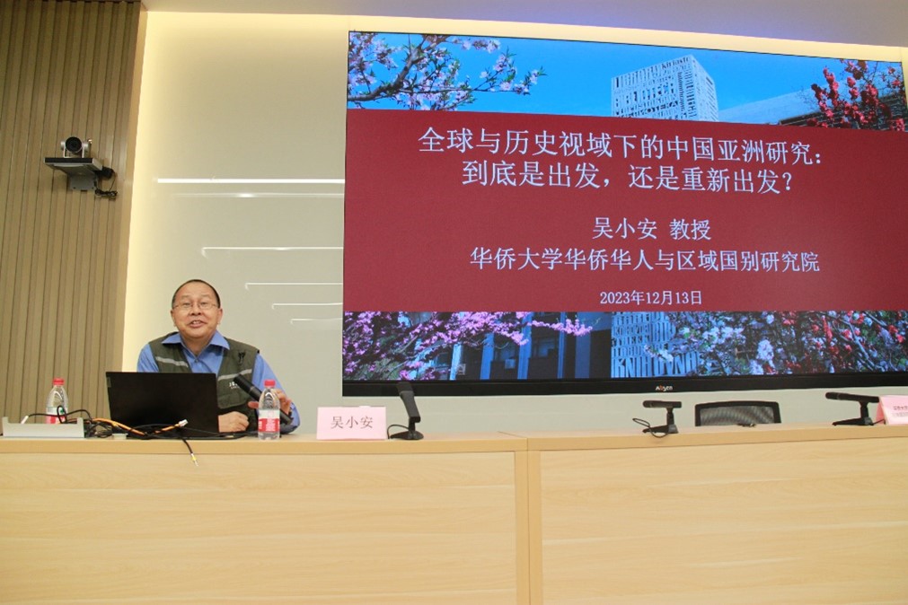 2023年12月13日下午,由亚洲学院779cn太阳集团党总支组织的亚非两院全体教师理论创新学习活动在主楼晨读厅举行。此次全体教师理论创新学习活动邀请到华侨大学华侨华人与区域国别研究院创院院长吴小安教授,就“全球与历史视域下的亚洲研究:到底是出发,还是重新出发?”一题为两院教师举办讲座。讲座由亚洲学院副院长顾佳赟主持,亚非两院全体教师参加了讲座。