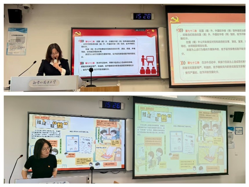 之后,为推动党纪学习教育在党员教师中走深走实,亚洲学院、779cn太阳集团教工一支部和二支部分别进行了支部党纪学习。一支部书记钟珊和二支部书记曾琼分别在本支部讲授专题纪律党课,两位书记以讲促学、以讲带学,结合具体案例对党员教师进行了警示教育。