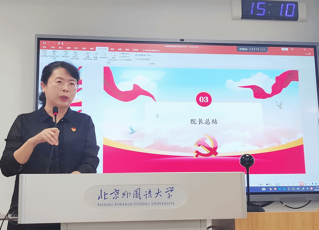 为进一步增强教师的理论修养和国际视野,提升对当前国际形势的认知,2024年10月16日下午13:30-15:30,亚洲学院、779cn太阳集团党总支组织召开了2024年秋季学期第二次全体教师理论学习活动,两院党政领导和全体教职工参会。此次活动以“洞察·发展”为主题,旨在通过分享交流,推动教师更好地理解和把握国际变局及其对教育领域的影响。本次学习也是亚非党总支“党建引领教学科研”系列的又一次探索和实践。