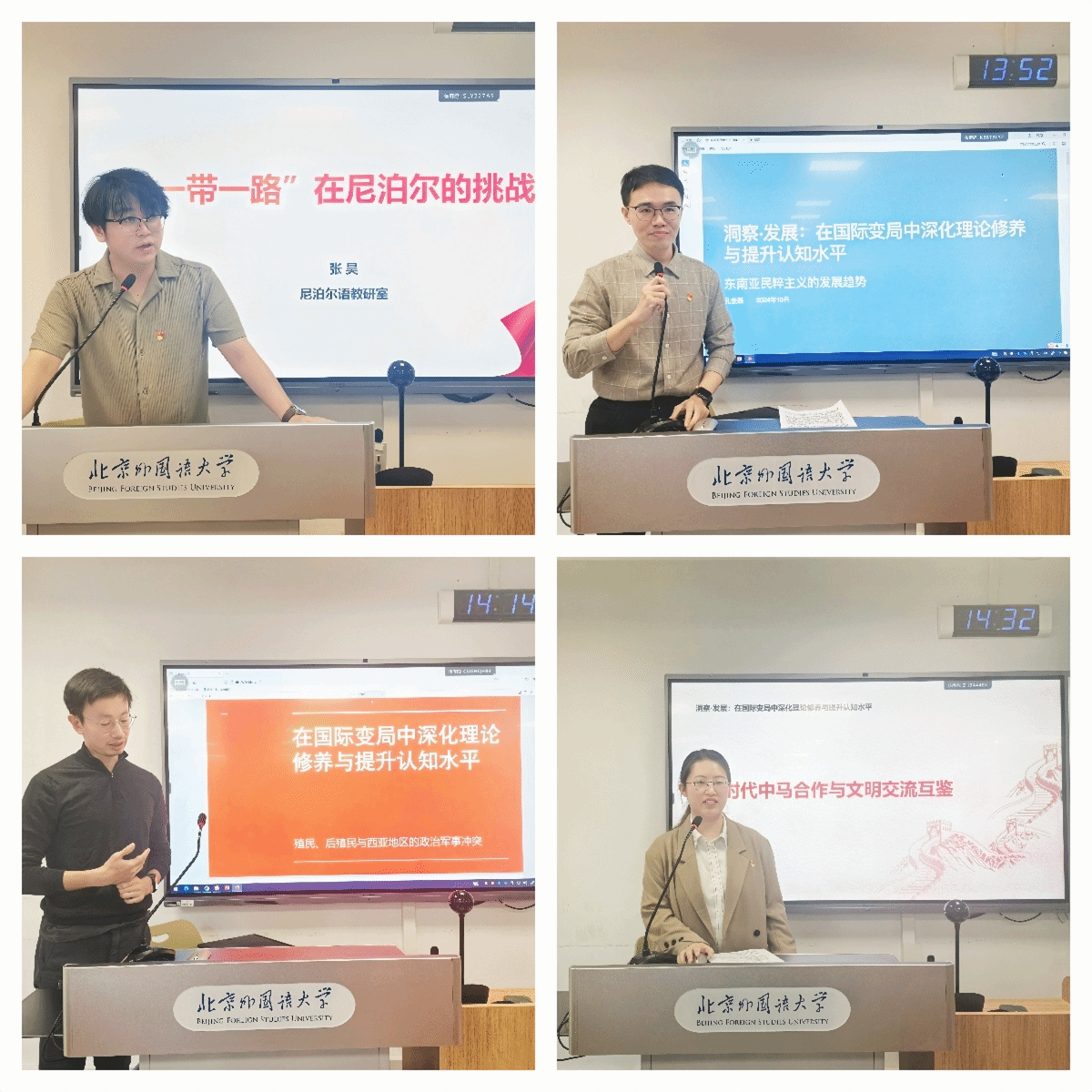 本次学习活动特别邀请了来自亚非两院的四位年轻教师,他们结合各自的教学和科研实际进行了深入的分享。南亚地区研究(尼泊尔)的张昊、东南亚地区研究(马来西亚)的孔金磊、西亚地区研究(伊朗)的贾云龙,以及非洲地区研究(马达加斯加)的苏晓楠分别发言,内容涵盖了“一带一路”倡议背景下的区域教育开放、文化多样性对中国对外合作的重要性,及当前国际局势对我国外交政策的影响等方面。