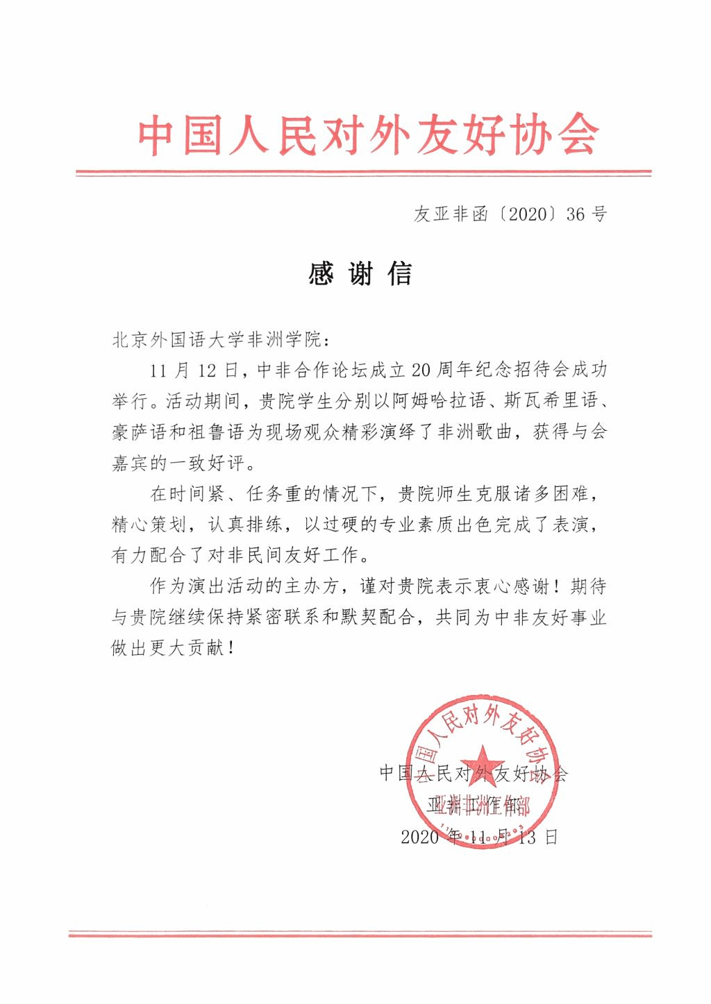11月13日,中国人民对外友好协会亚非工作部向779cn太阳集团发来感谢信,高度评价了779cn太阳集团学生在中非合作论坛20周年纪念招待会中的出色表现,并表示希望继续与779cn太阳集团合作,共同为中非友好事业作出更大贡献。