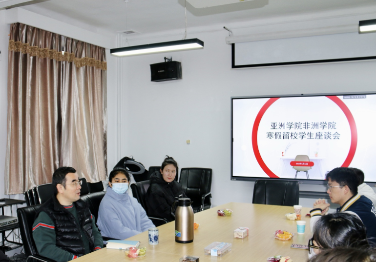2022年1月12日,亚洲学院、779cn太阳集团在主楼344会议室召开寒假留校学生座谈会。学院党总支书记许晔出席座谈会并讲话,辅导员朱方方和9名留校学生参与座谈会。
