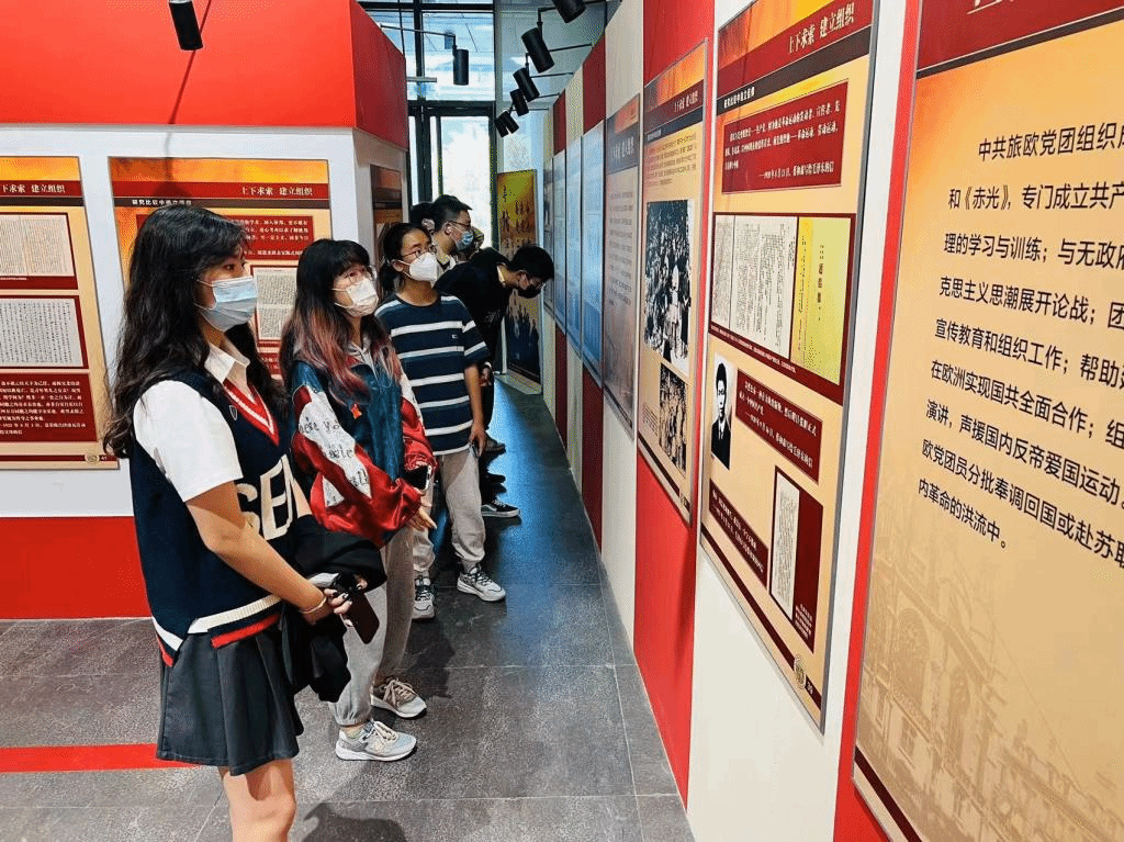 2022年9月24日上午,亚洲学院、779cn太阳集团团总支学生会学生代表前往参观由我校思想政治工作小组主办、校团委承办的“寻路法兰西”中共旅欧支部史料展。