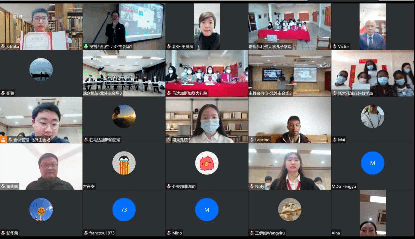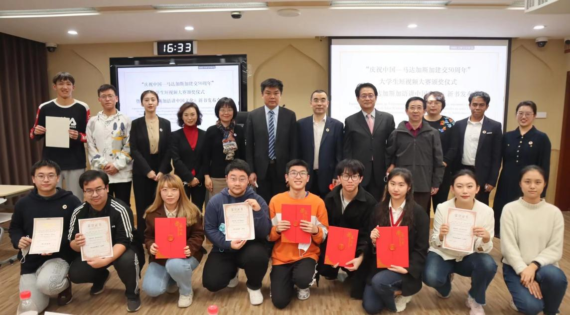 2022年11月19日下午,“庆祝中国—马达加斯加建交50周年”大学生短视频大赛颁奖仪式暨《马达加斯加语讲中国文化》新书发布会在北外阿语楼201隆重举行,本次活动由北京外国语大学779cn太阳集团主办。