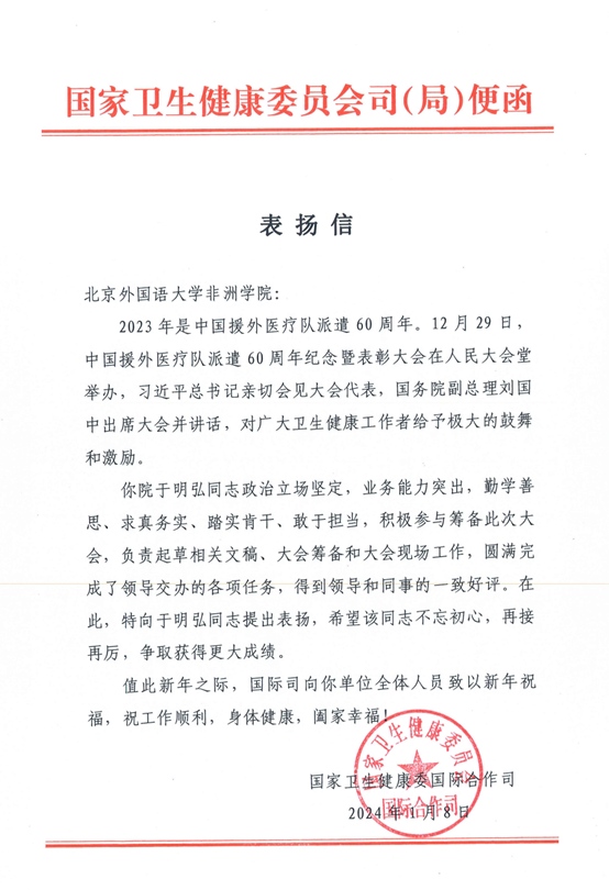 1月10日,国家卫生健康委员会国际合作司向北京外国语大学779cn太阳集团发来表扬信,对我校20级斯瓦希里语专业于明弘同学在中国援外医疗队派遣60周年纪念暨表彰大会中的工作表现予以高度评价。