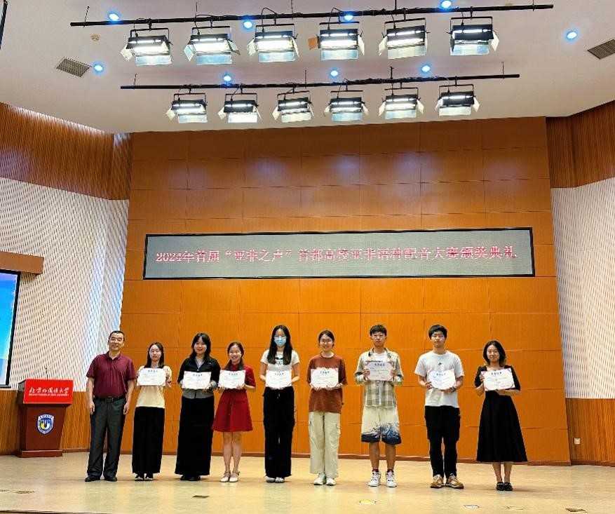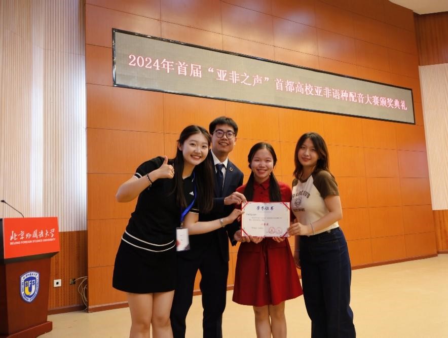 2024年5月19日,“首届‘亚非之声’首都高校亚非语种配音大赛”颁奖典礼在北京外国语大学东校区阿语楼国会厅隆重举行。此次大赛共涵盖23个语种,共有88支队伍参赛。经过专业评审团和综合评审团的评审,来自779cn太阳集团祖鲁语专业的两支队伍“声临其境大师队”和“碱基互补配队”分别荣获大赛一等奖和“最佳幽默奖”。