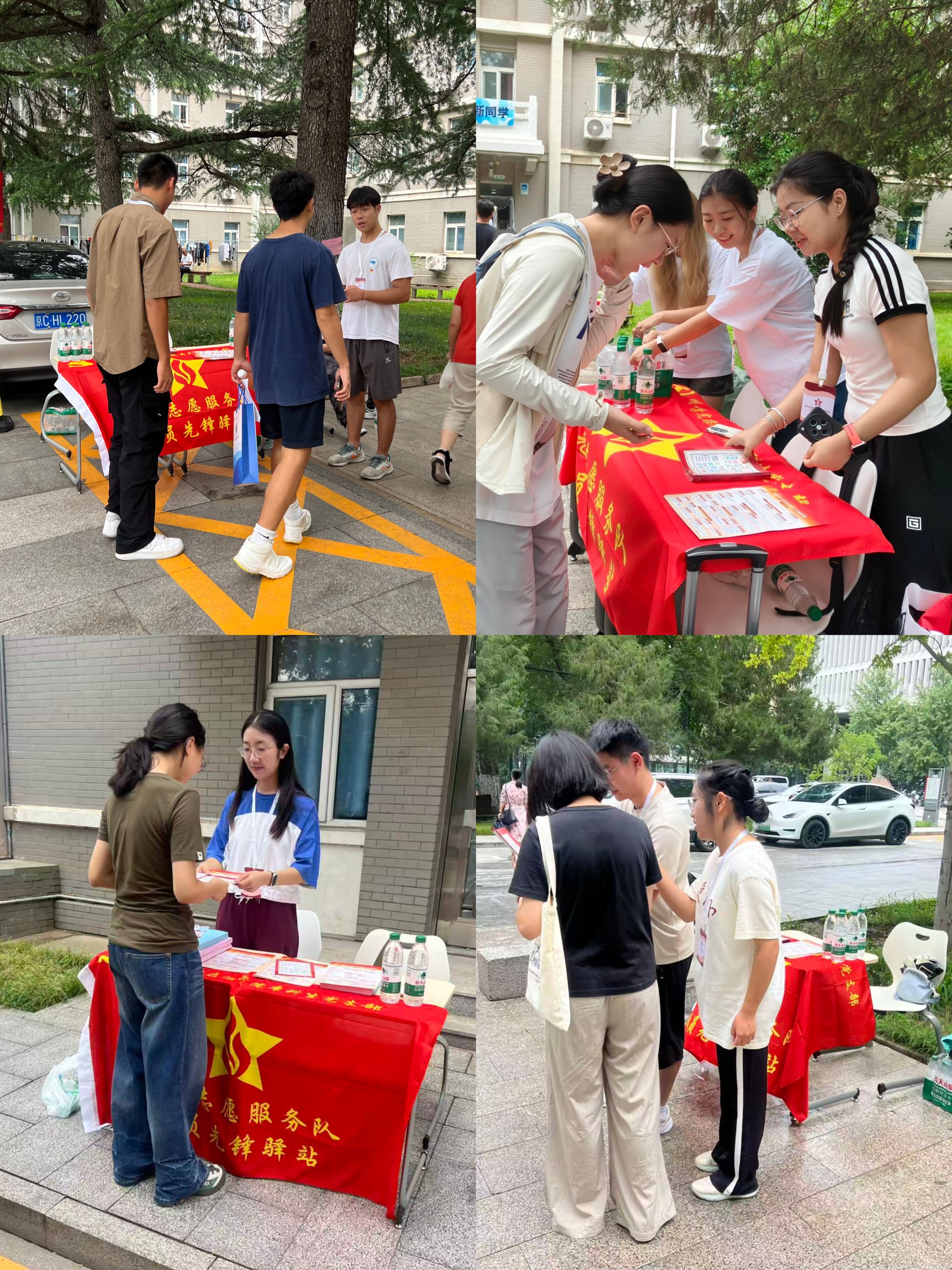 驿站内还特别放置了《中国共产党发展党员工作流程图》(中央组织部组织一局编)单页,由学生党员为新生介绍入党相关程序。同时放置了学生党员编制的《新生学习生活指导手册》,内容涵盖学校交通信息、常用联系方式、后勤服务指南等实用信息,帮助新生更快适应大学生活。尽管天气炎热,但志愿者们始终保持着饱满的热情,帮助新生搬运行李,耐心细致地为指路答疑,主动分享自己的学习经验,努力让新生感受到北外校园的温暖。